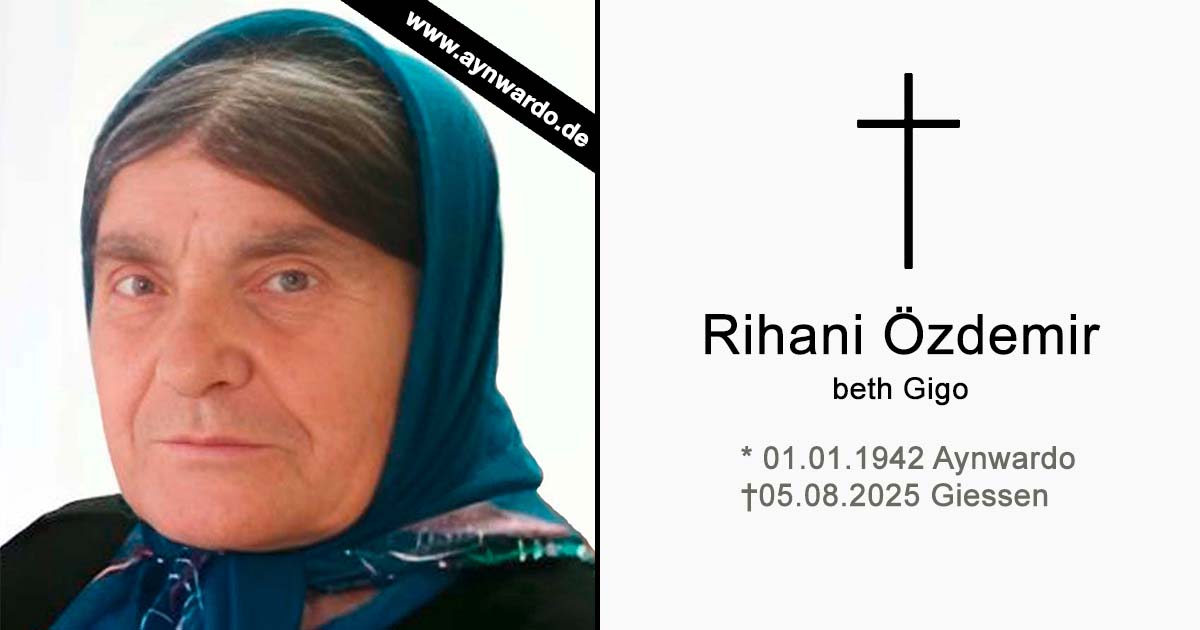 Beitrag veröffentlicht:6. August 2025 †Rihani Özdemir beth Hışşo-Gigo† *01.01.1942 Aynwardo †05.08.2025 Pohlheim/Gießen Aloho Mhasela – Risho Basimo li Ikartho